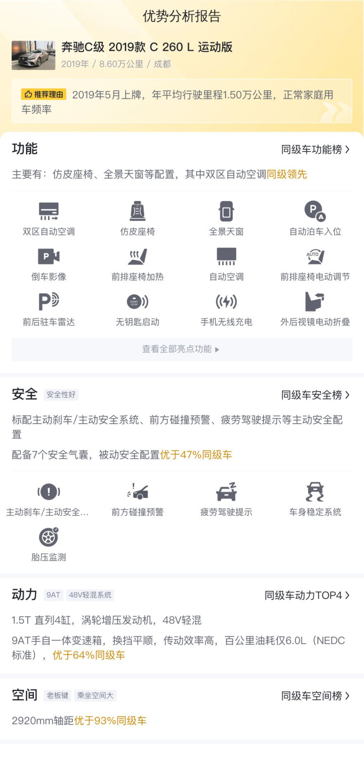该车是奔驰C级 2019款 C 260 L 运动版,运动轿车,车身颜色为香槟色,后驱,自动变速,排量1.5T,国IV排放标准,全景天窗,全景摄像头,双区自动空调,座椅加热,定速巡航,新车含税价为38.31万,现二手车报价为15.18万。截至2025年1月,该车行驶里程为8.6万公里,2019年5月首次上牌,期间过户1次,车源地跟上牌地都是成都。